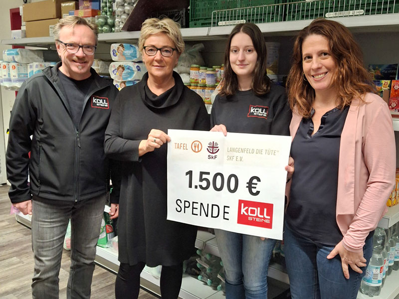 Zum Jahresabschluss setzt KOLL Steine ein bewusstes Zeichen für gesellschaftliche Verantwortung und regionales Engagement. Mit einer Spende in Höhe von 1.500 Euro unterstützt das Unternehmen die Tafel Langenfeld und würdigt damit die wichtige Arbeit, die dort tagtäglich für bedürftige Menschen geleistet wird.
