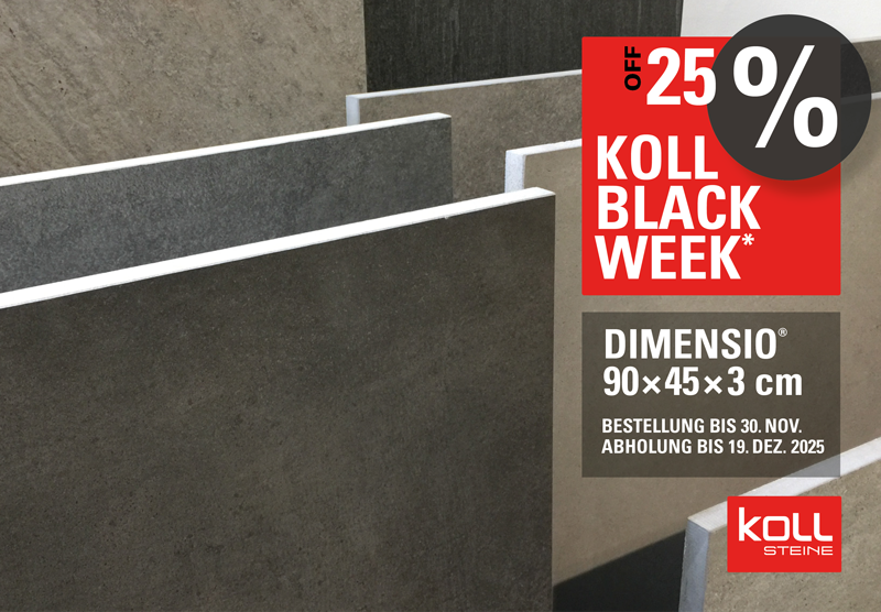 Die KOLL BLACK WEEK startet – und bringt eine besonders attraktive Aktion für alle, die Außenflächen modern, langlebig und stilvoll gestalten möchten. Für kurze Zeit erhalten Sie 25 % Rabatt auf die DIMENSIO®-Platte 90 × 45 × 3 cm in den verfügbaren Farben. Der Preisvorteil gilt bei Bestellung über den Baustofffachhandel auf die aktuelle KOLL-Preisliste 2025, ab Werk. Eine ideale Gelegenheit, hochwertige Platten zu einem besonders günstigen Konditionspreis zu beziehen.
