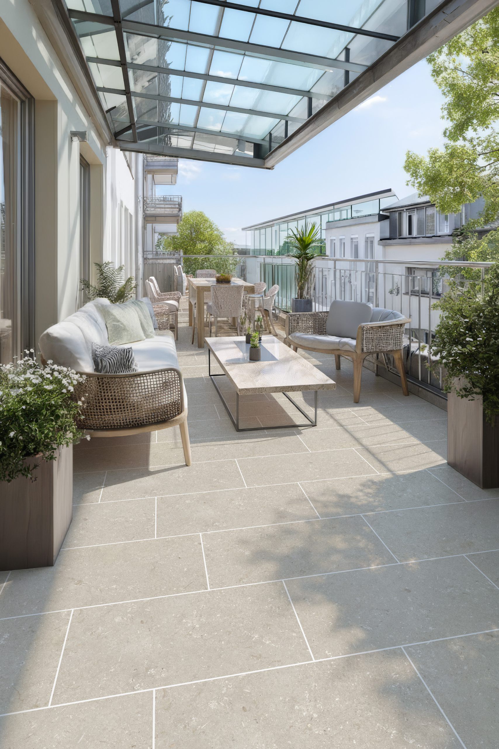 Im Gegensatz zu herkömmlichen 2 cm starken Feinsteinzeugplatten-Belägen im Außenbereich besitzt die innovative 3 cm starke DIMENSIO durch ihr 50% höheres Plattengewicht eine deutlich bessere Lagestabilität bei der ungebundenen, kostengünstigen Verlegung auf Splitt. Spannende Oberflächendesigns, von modernem Sichtbeton bis behaglich und zeitlos schönen Natursteinoptiken, bringen Freude bei der neuen Terrassengestaltung.