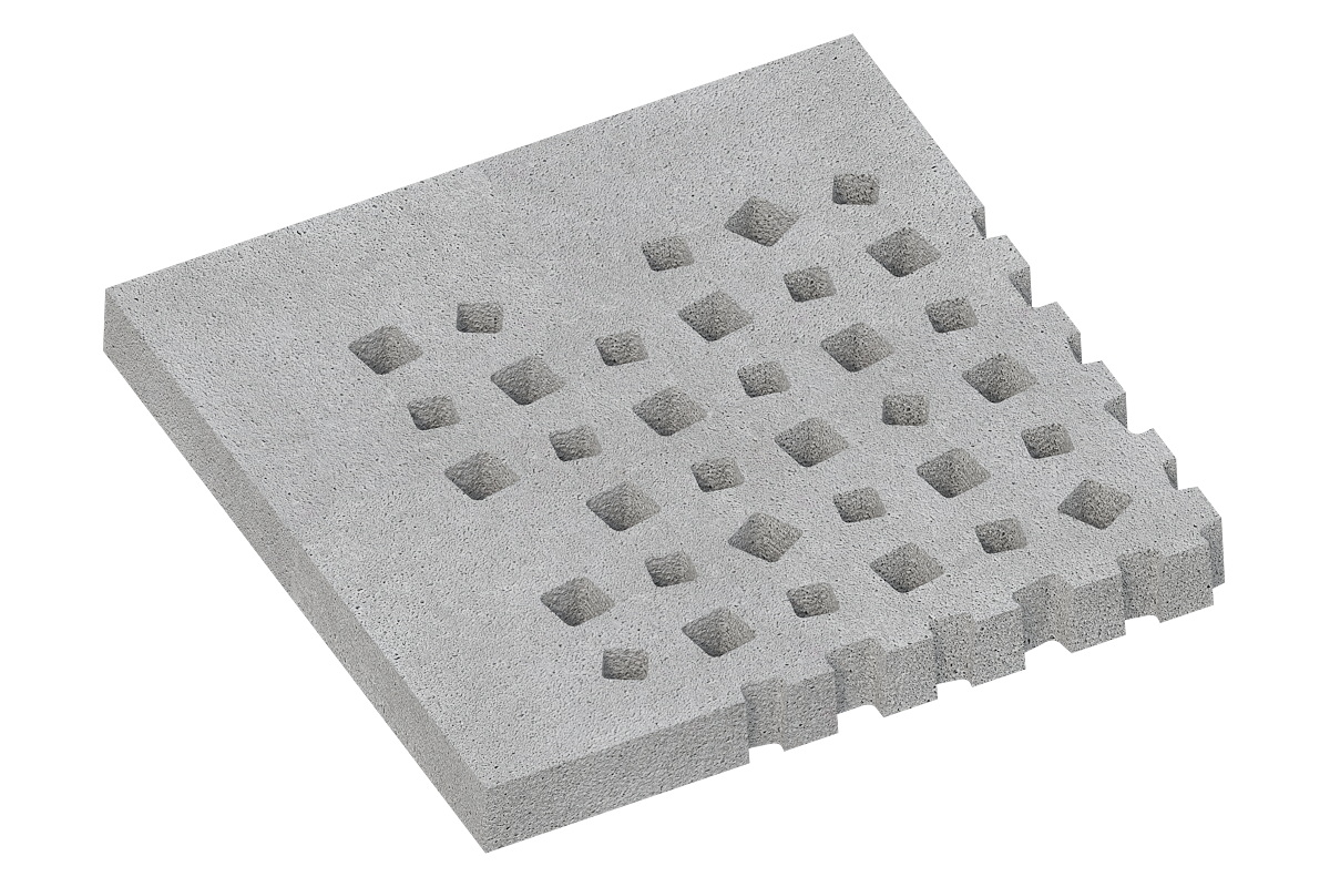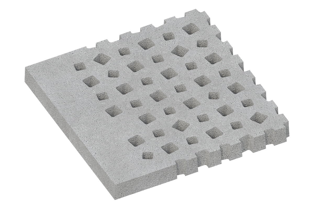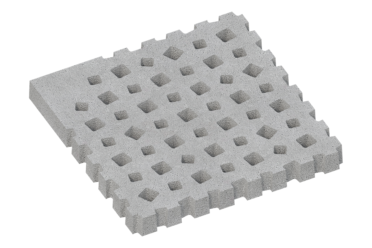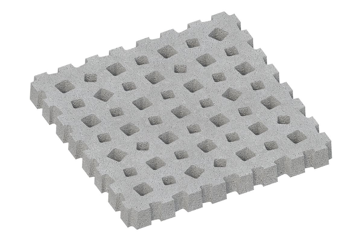 Das System besteht aus vier unterschiedlichen Plattenvarianten im Format 100×100×10 cm, jeweils mit integrierter Stahlarmierung. Die Platten verfügen über verschieden gestaltete Einlassöffnungen, die wahlweise zur Begrünung oder zur Splittfüllung genutzt werden können und so eine effektive Entwässerung und Versickerung ermöglichen.