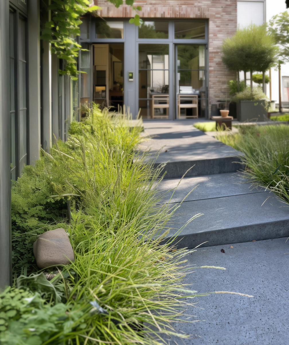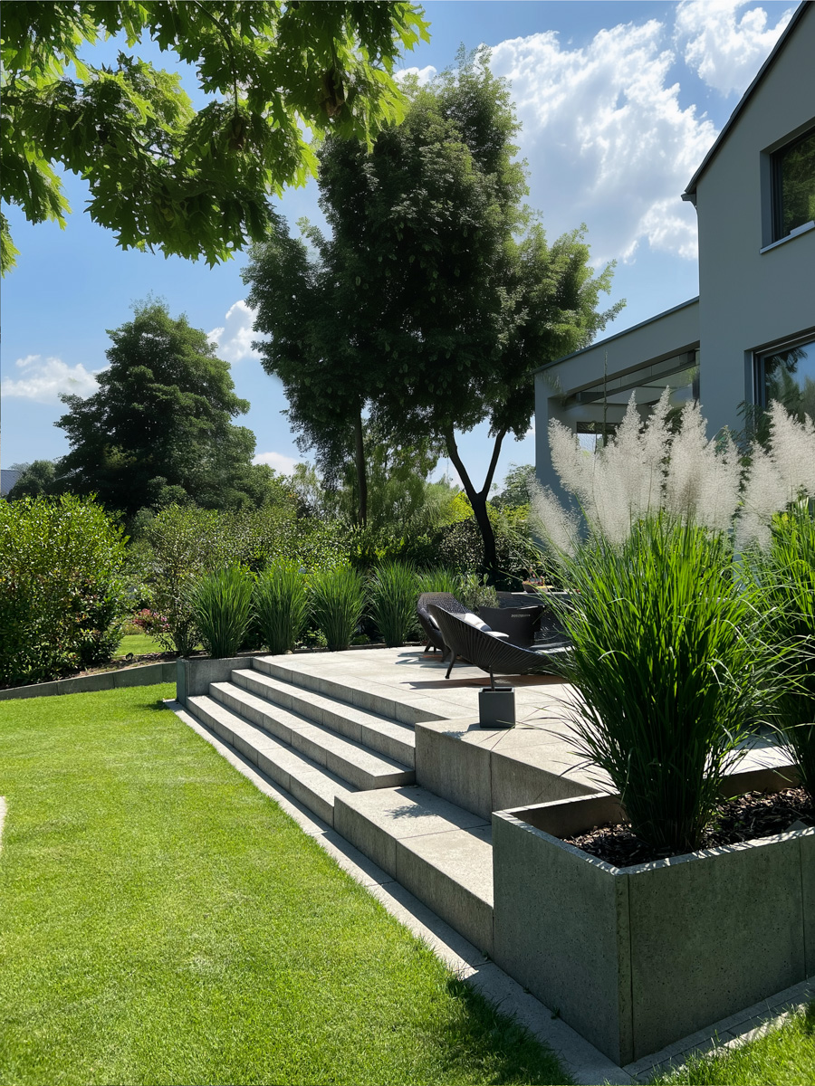 Die verschiedenen Elemente wie Platten, Blockstufen, Schwebestufen und Randsteine in einer einheitlichen Struktur und Farbe verleihen dem Gartendesign eine exklusive und zeitlos schöne Gestalt!