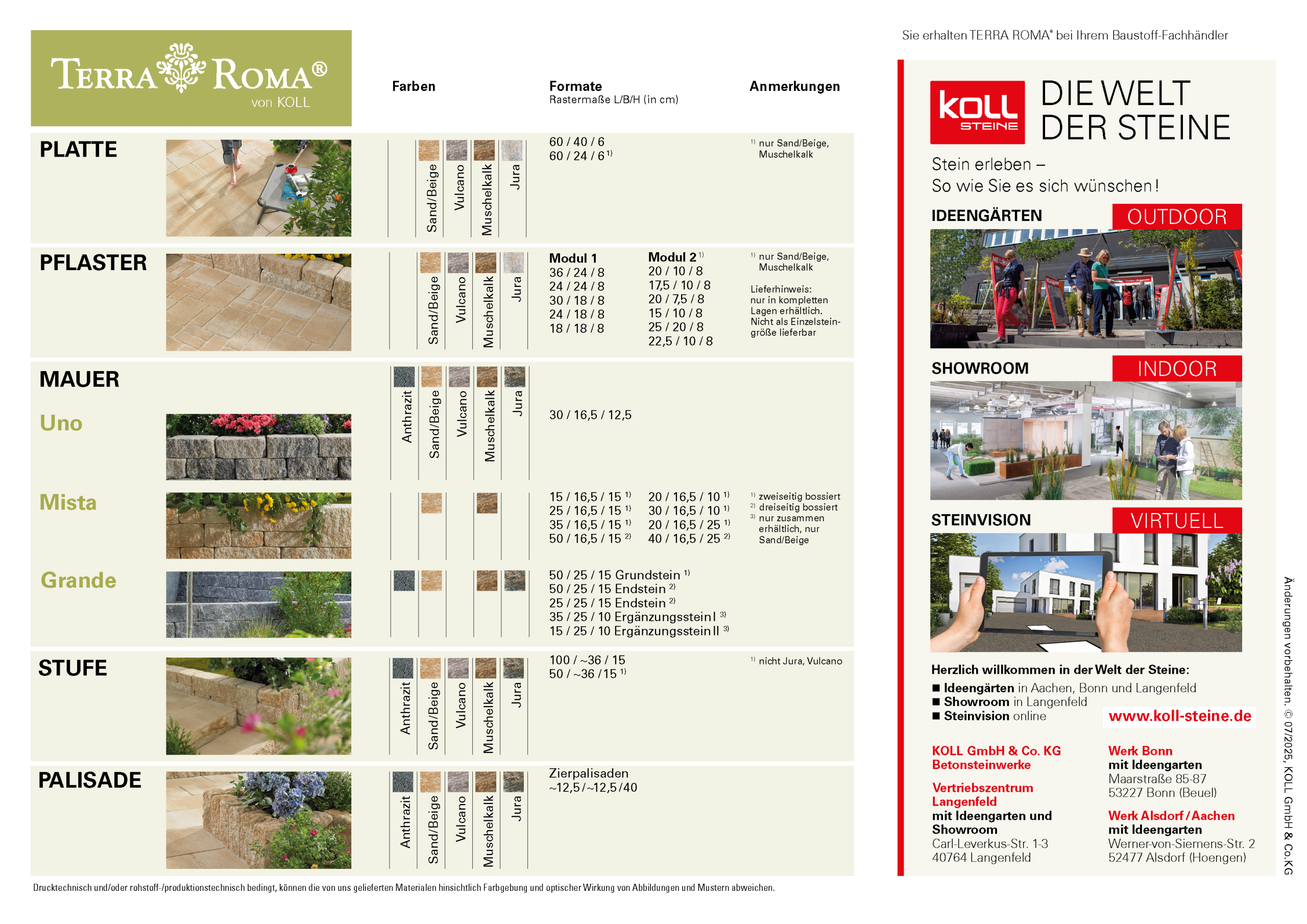 Von handlichen S-Formaten bis zu eindrucksvollen XXL-Platten, von Zierpflaster über Stufen und Palisaden bis zur Gartenmauer finden Sie hier alles, was Ihr Projekt einzigartig macht. Wählen Sie Ihr Wunschthema – und starten Sie die Reise zu Ihrem ganz persönlichen Lieblingsplatz.
