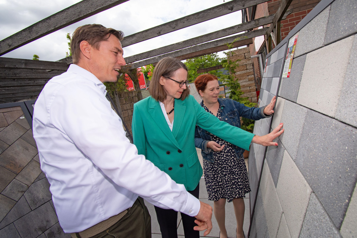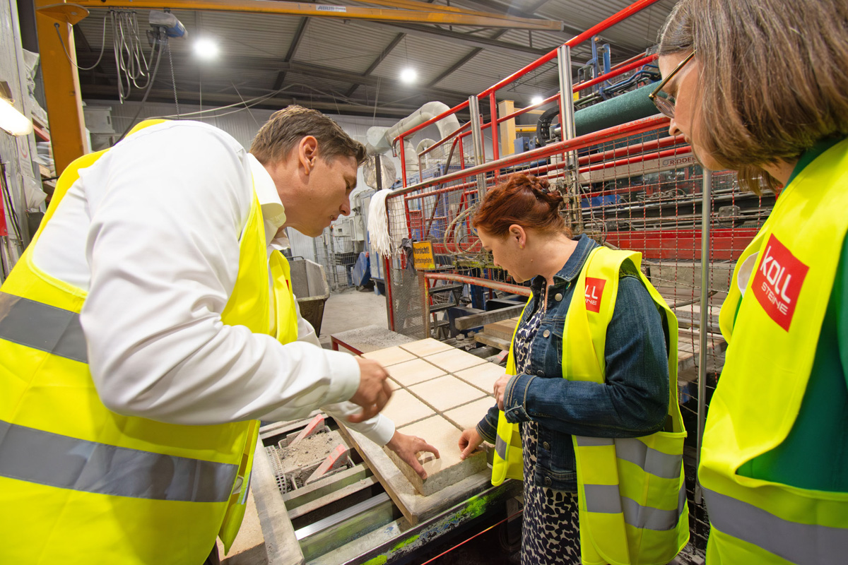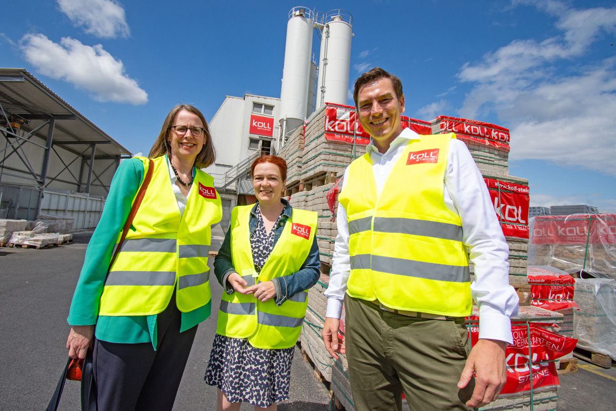 In Beuel an der Maarstraße traf die Oberbürgermeisterin Helge Koll, Inhaber und Geschäftsführer von Koll Steine, sowie Monika Alsbach, Assistenz der Geschäftsführung. Nachdem Helge Koll sein Unternehmen vorgestellt hatte, ging es auf einen Rundgang durch die Produktion, das Lager und den Ideengarten. Auf dieser Outdoor-Fläche können sich Kund*innen Inspiration für ihre eigenen Projekte holen und sehen, wie die Stein-Produkte und Gestaltungselemente zur Wirkung kommen können. Koll bietet ein breites Sortiment an Betonprodukten, darunter Pflastersteine, Terrassenplatten, Palisaden, Gartenmauern und spezielle Ökopflaster für den Garten- und Landschaftsbau. Das Unternehmen gehört zu den traditionsreichen mittelständischen Betrieben im Bonner Stadtgebiet mit Stammsitz in Beuel und Niederlassungen in Langenfeld und Alsdorf.