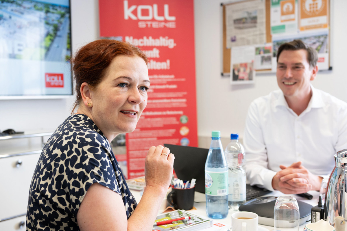 Im Austausch nach der Betriebsführung ging es unter anderem um Mobilitätsthemen, wie gewerbliche Verkehre oder die Anbindung des Unternehmens an das Autobahnnetz. Auch die Themen Digitalisierung und Netzinfrastruktur kamen zur Sprache. Die OB berichtete, dass das Gewerbegebiet Beuel-Ost voraussichtlich 2026 über den „Sonderaufruf Gewerbegebiete, Industrieparks, Schulen und Krankenhäuser“ mit Glasfaser erschlossen werden wird. Katja Dörner sagt abschließend: „Das Engagement von KOLL Steine für Klimaschutz und Klimaanpassung ist beeindruckend.“